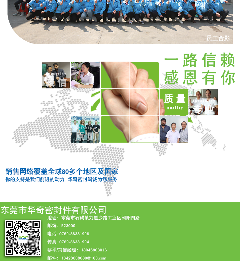 東莞市華奇密封件有限公司材料庫擁有超過數百種獨特的配方,并擁有在嚴苛環境下,如極端溫度、介質侵蝕、超高壓力時也具有優良的密封材料。高性能橡膠、硅膠原材料、全自動生產設備及先進的檢驗設備,為制造高質量的橡膠零件提供了強有力的保障。公司采用先進的管理理念,引進精良的工藝裝備和高素質的員工隊伍,在多年的工作過程中,把嚴格的品質落實在生產流程的每一個細節中,嚴格執行行業標準,規范操作,用科學嚴謹的工作態度確保華奇每一件產品精準可靠。產品暢銷全國近三十多個省、市自治區及遠銷國外。竭誠與國內外商家雙贏合作,共同發展,共創輝煌!