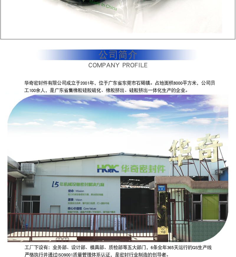 東莞市華奇密封件有限公司成立于2006年,位于廣東省東莞市石碣鎮,占地面積10000平方米,公司員工150余人,是廣東省集橡膠硅膠硫化、橡膠擠出、硅膠擠出一體化生產的新型企業。